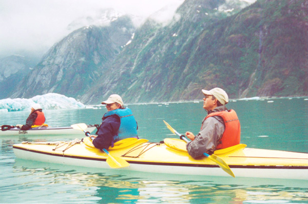 Mary & I in the Endicott Arm. I think we’re looking at an Eagle’s nest. In the single kayak is Andrea, one of the naturalists on board. Bergs in the background. Very milky water from the glacial silt.