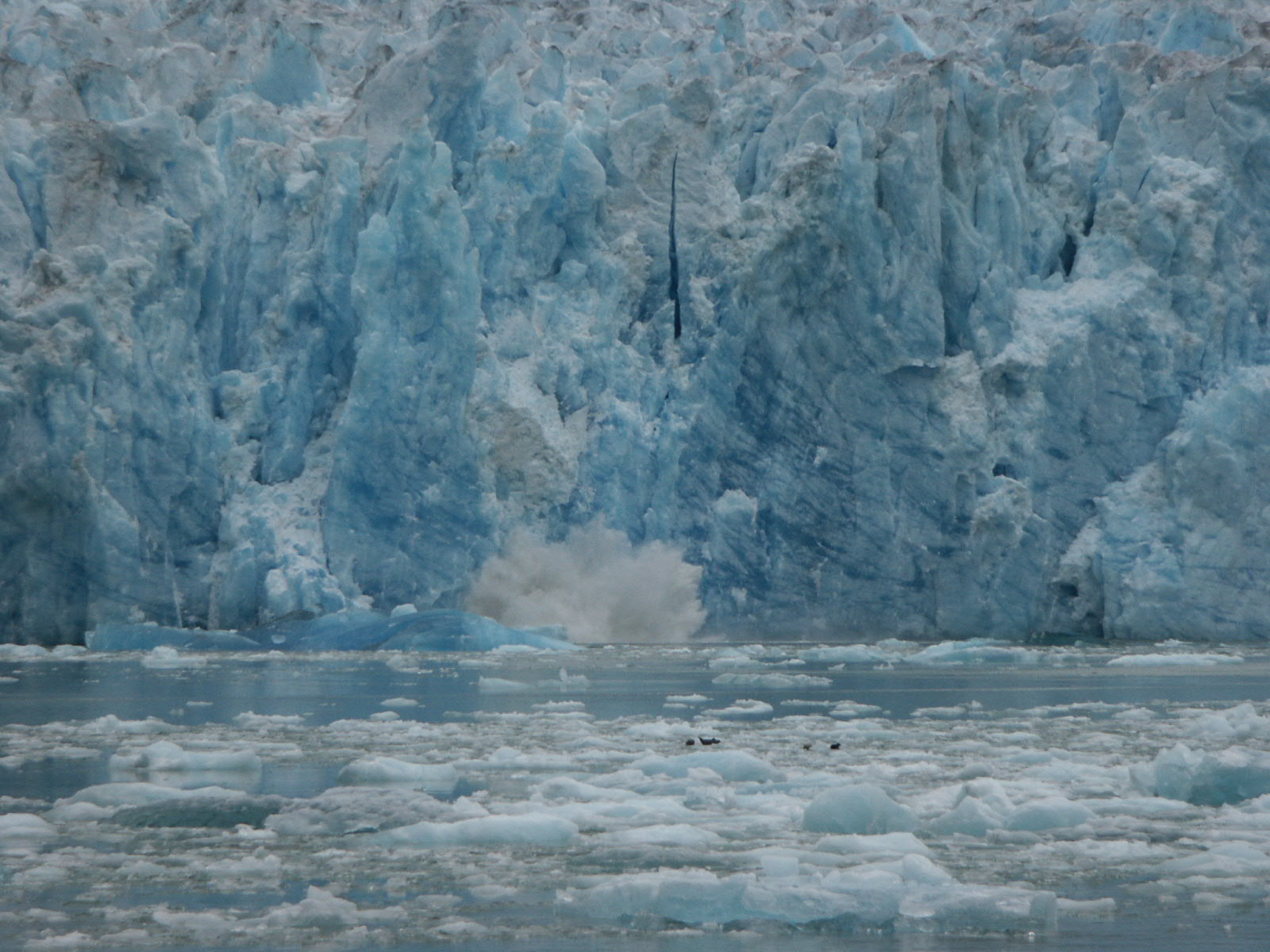 Berg calving from South Sawyer Glacier. You can see a large piece in the air just above the splash. Nice blue color in this view of the glacier. The small dark spots on the ice in the foreground are seals. They did not appear to be too disturbed by all the action.
